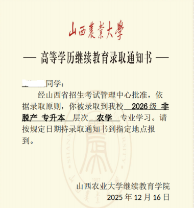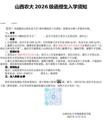 我院2025年成人高考录取工作已顺利完成。为方便考生及时查询并获取录取信息,我院将采用电子版录取通知书,由考生自行查询下载,不再统一邮寄纸质版本。现将查询方式及通知书样式说明如下: