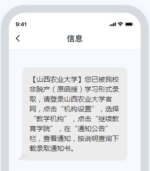 学院已通过短信平台,向各位考生报名时预留的手机号码发送通知,提醒登录学院网站查看并下载录取通知书。短信通知示例见图1。